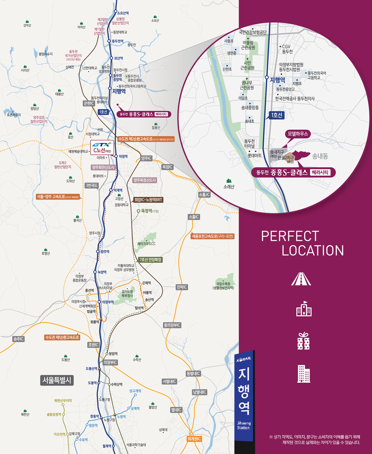 ※ 본 개발계획도상에 표기된 사지 개발 및 교통, 학교 등의 계획에 대한 사항은 추후 관계기관의 사정에 따라 변경 및 취소 될 수 있습니다.
